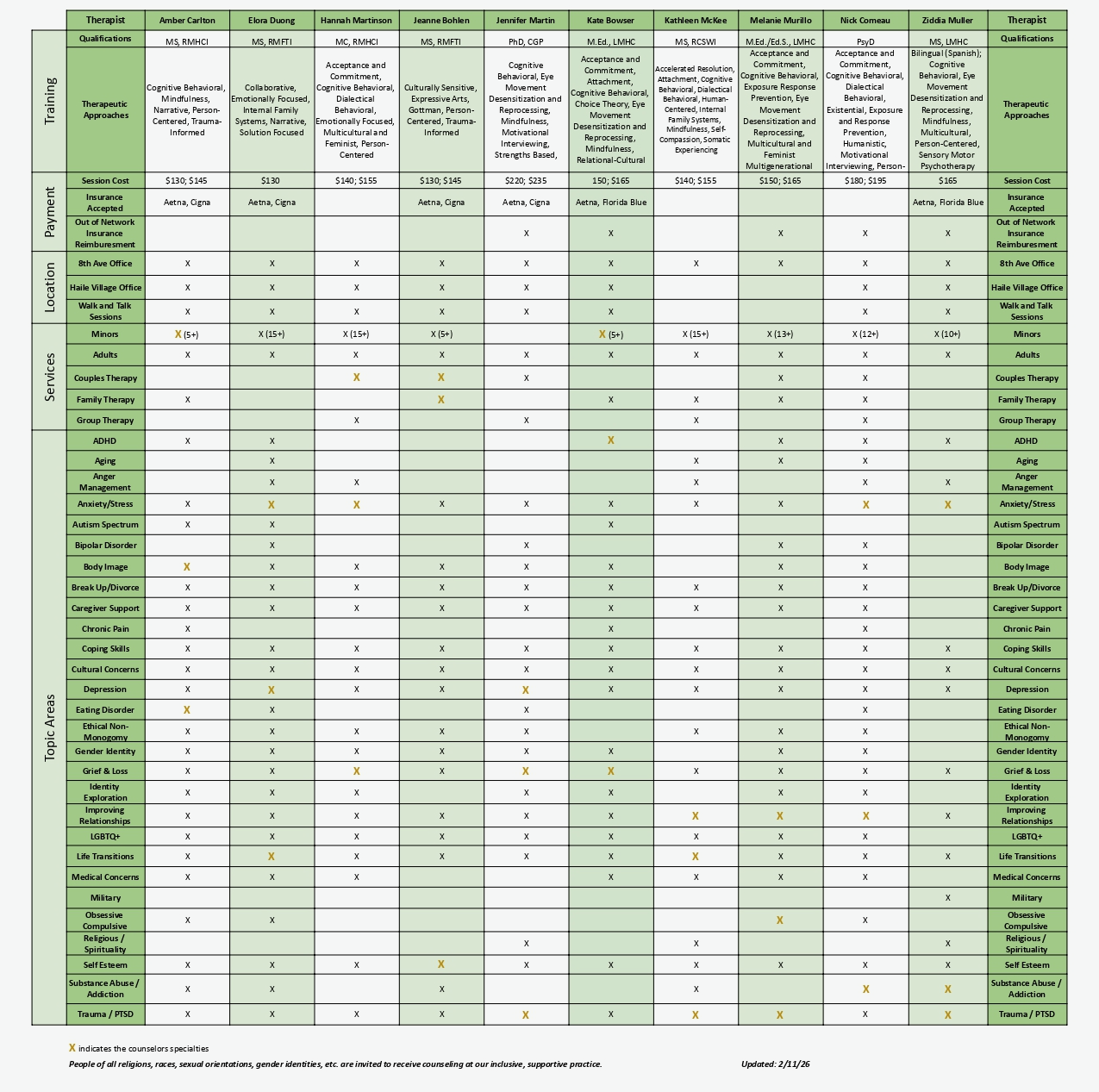 We have different team members at each location. See the chart at the bottom for more information about each counselor’s areas of expertise and pricing.